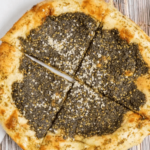 Naan topped with olive oil, zaatar herbs, and sesame seed