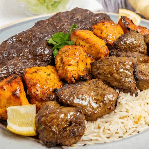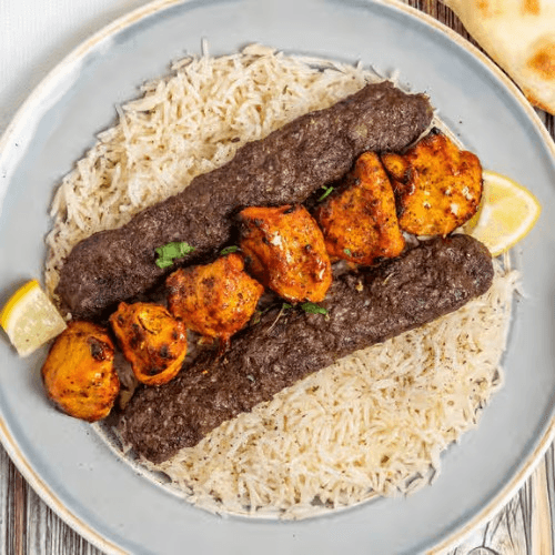 One Skewer of boneless lamb kabob and two skewers of ground beef kabob served over rice with sides of chickpeas, house salad, naan, and tziki and green chutney dipping sauce