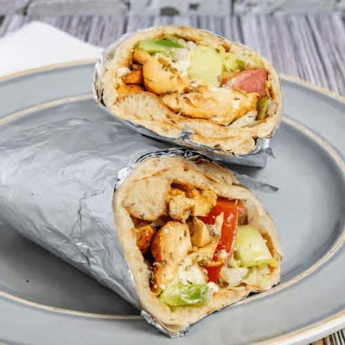 Chicken Kabob pieces wrapped in naan with lettuce, tomato, cucumber, onion, green bell pepper, feta cheese, and tziki sauce