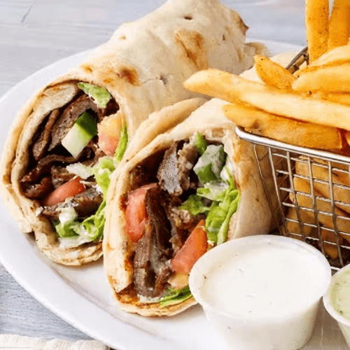 Sliced Gyro meat (lamb beef mix) wrapped in naan with lettuce, tomato, cucumber, onion, green bell pepper, feta cheese, and tziki sauce
