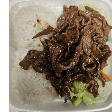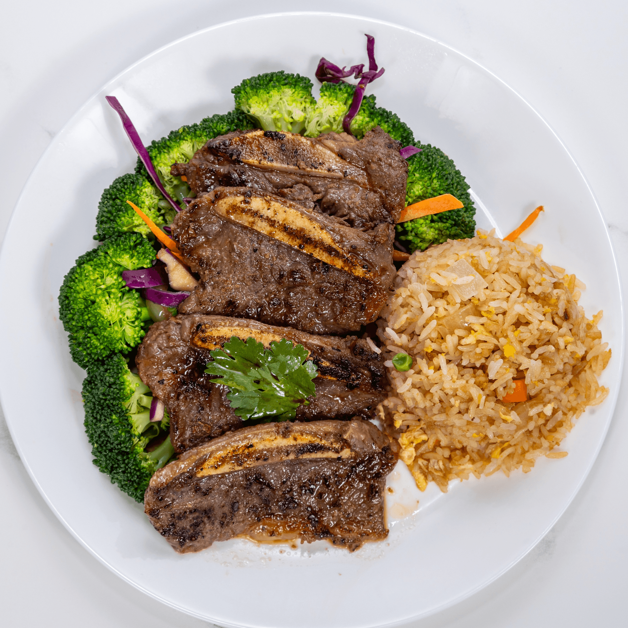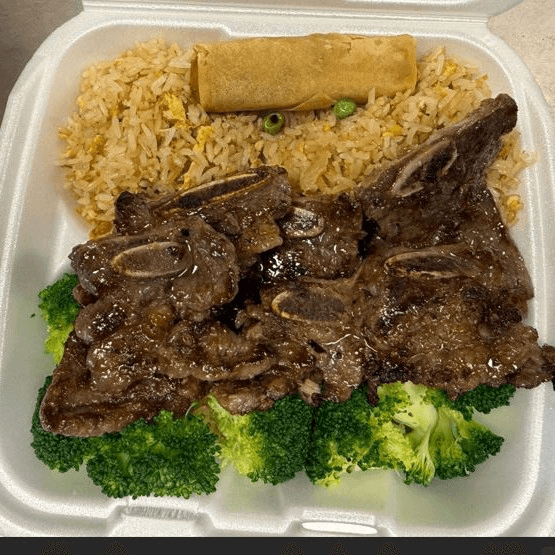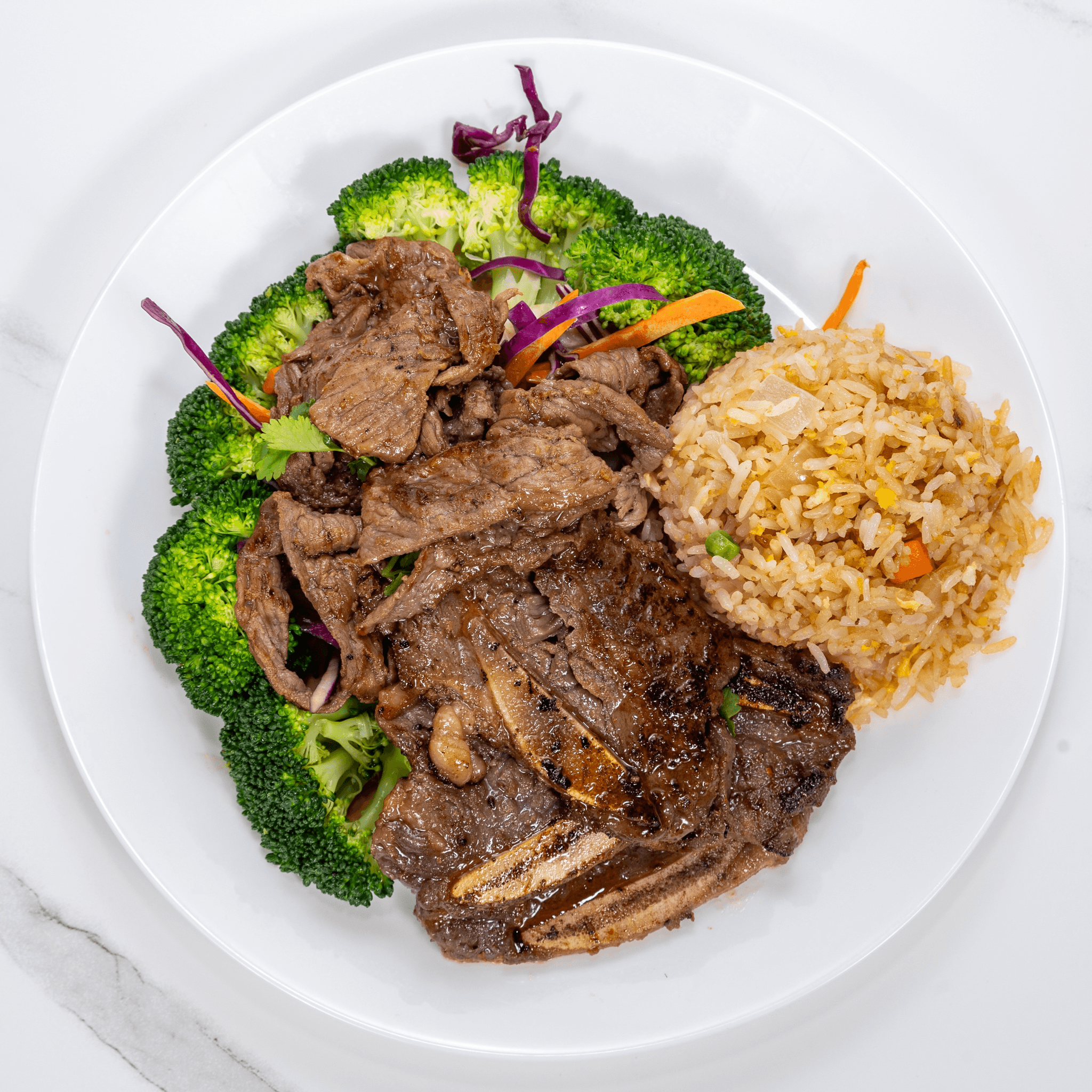 BBQ beef & short rib. Served with vegetables & spring roll, white rice, or fried rice.