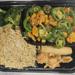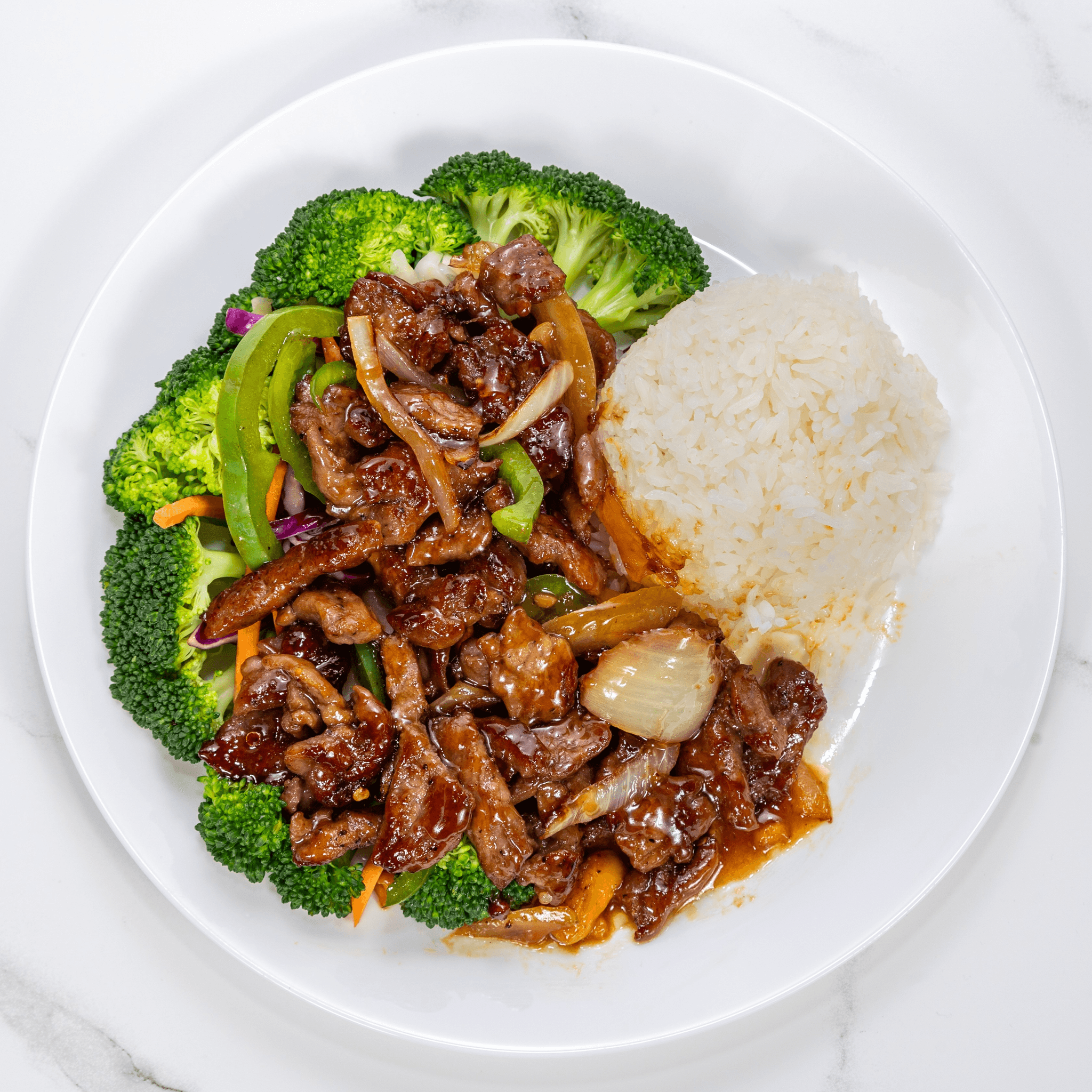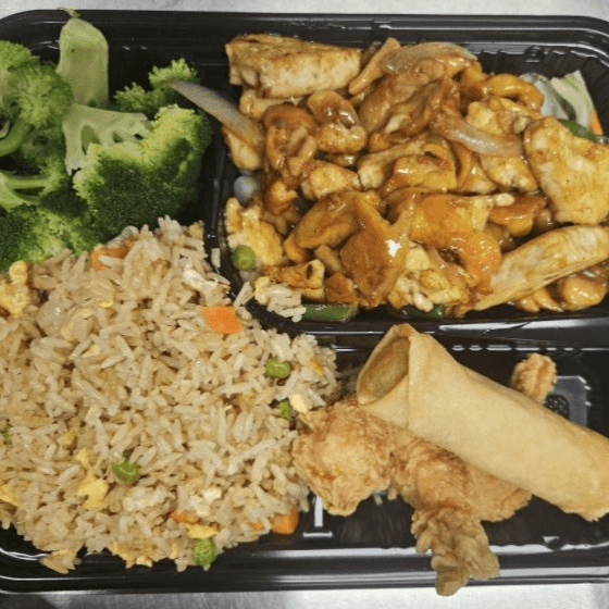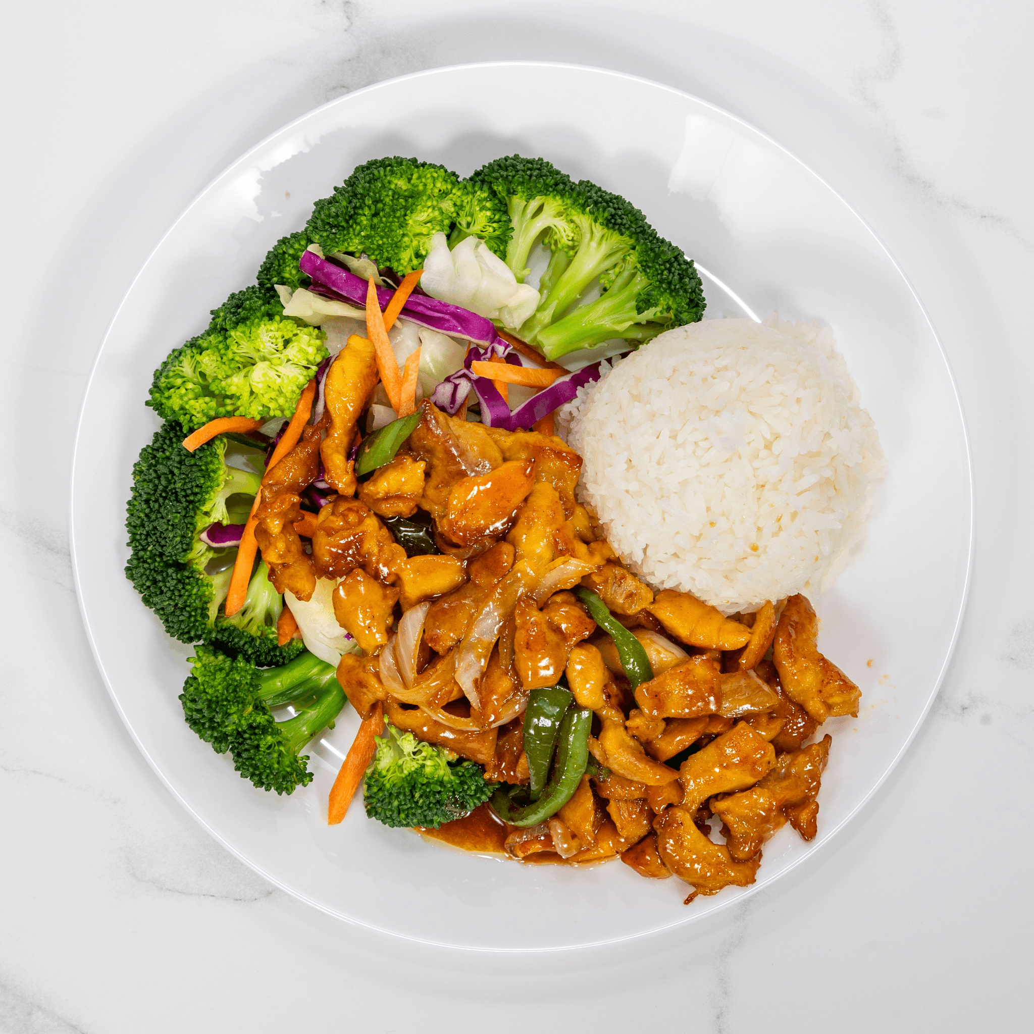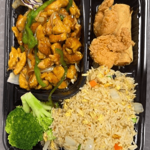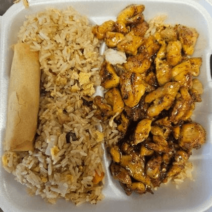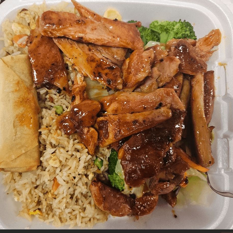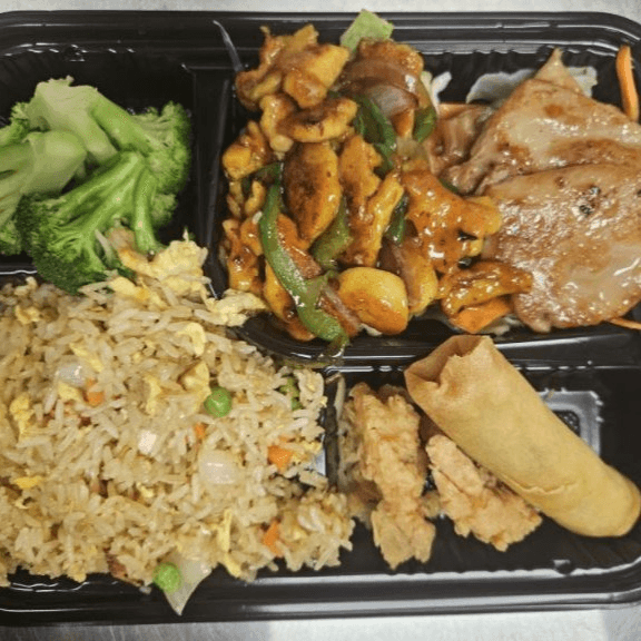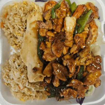 Chicken, beef and shrimp. Served with vegetables, macaroni salad or spring roll, & steamed rice or fried rice.