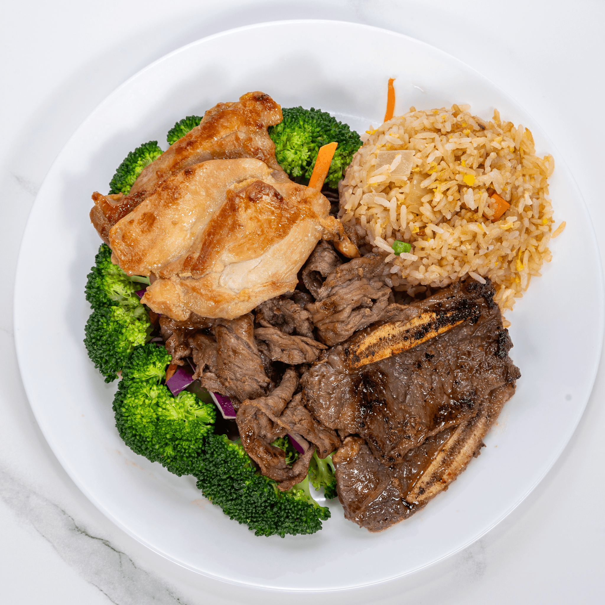Chicken, beef, and short ribs. Served with vegetables & spring roll, white rice, or fried rice.