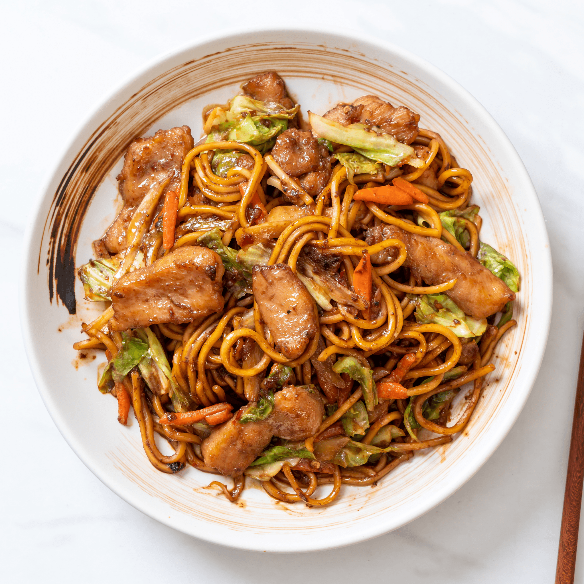 Savory stir-fried noodles tossed with vegetables and a rich soy-based sauce, packed with bold umami flavor