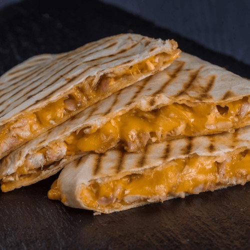 Grilled flour tortilla stuffed with steak or chicken and cheese. Served with a side of sour cream and pico de gallo