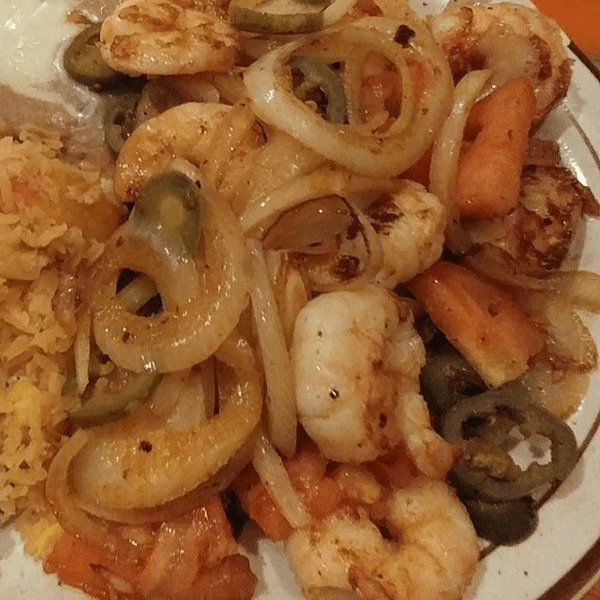 Shrimp sautéed in our homemade green ranchero sauce, served with a side of rice, beans, and 3 flour tortillas