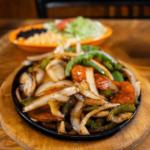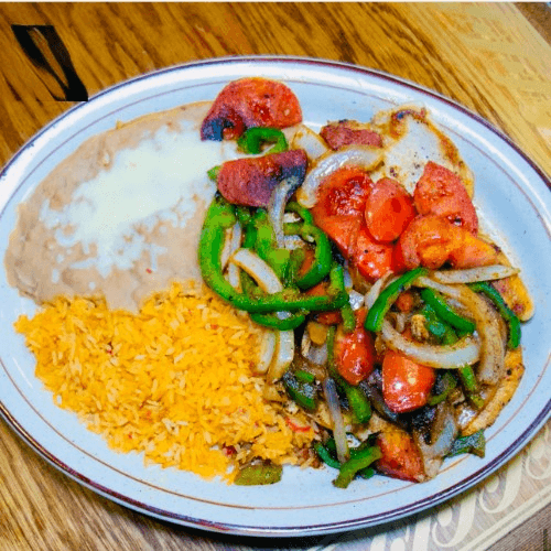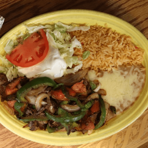 Steak, chicken or mix with onions, bell peppers, tomatoes, salad, rice, beans and tortillas