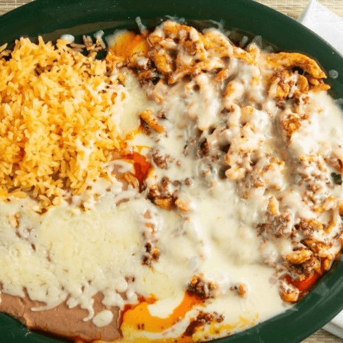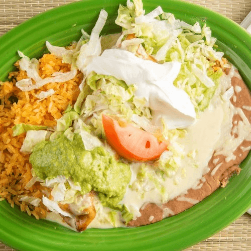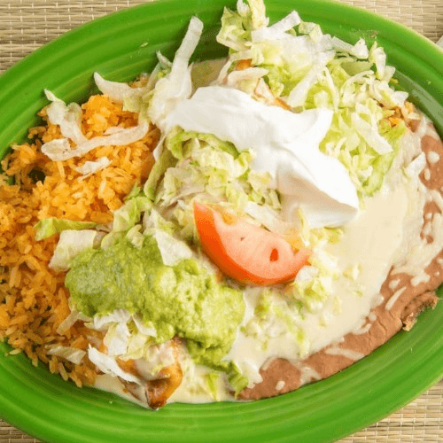 Two cheese enchiladas topped with beef or chicken. Served with lettuce, tomato, sour cream. Side rice, beans