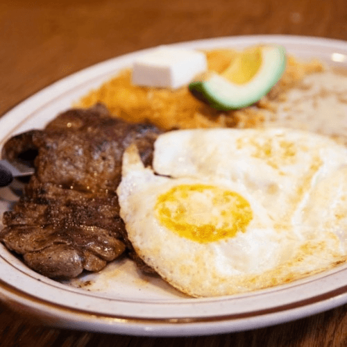 Carne asada, 2 eggs, avocado slices, rice beans, Mexican cheese and tortillas