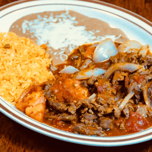 Steak strips sautéed with onions, tomatoes, ranchero sauce & Mexican spices. Served with rice, beans & tortillas