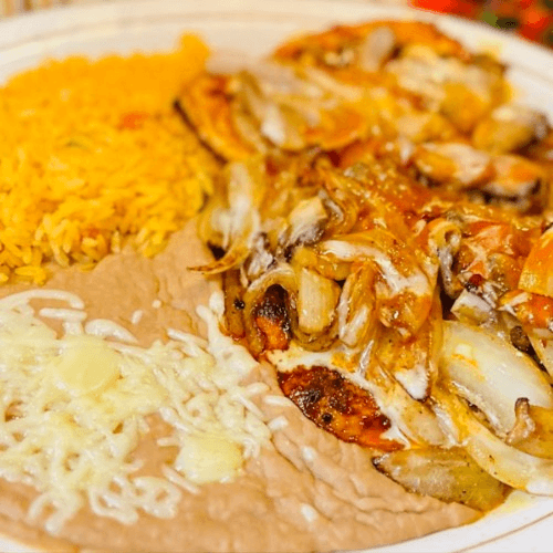 Grilled chicken breast topped with grilled onions, mushrooms, queso sauce, enchilada sauce, rice, beans and tortillas