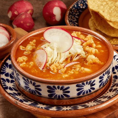 A hominy soup with a guajillo red pepper base flavor with pork meat served with a side of cabbage, lime and oregano