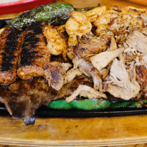 Grilled steak, chicken, chorizo, carnitas & shrimp on a bed of grilled onions & peppers. Served with rice, beans, lettuce, guacamole, sour cream, salsa verde, pico de gallo & flour tortillas