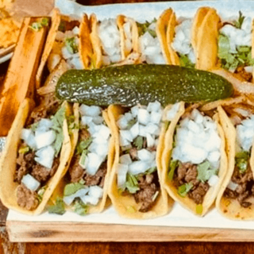 5 per choice. Steak, carnitas, chorizo, chicken, lengua or al pastor for additional cost per each five. Mini street tacos with your choice of meat topped with cilantro and onion. Served with two sides of rice, beans and garnishes